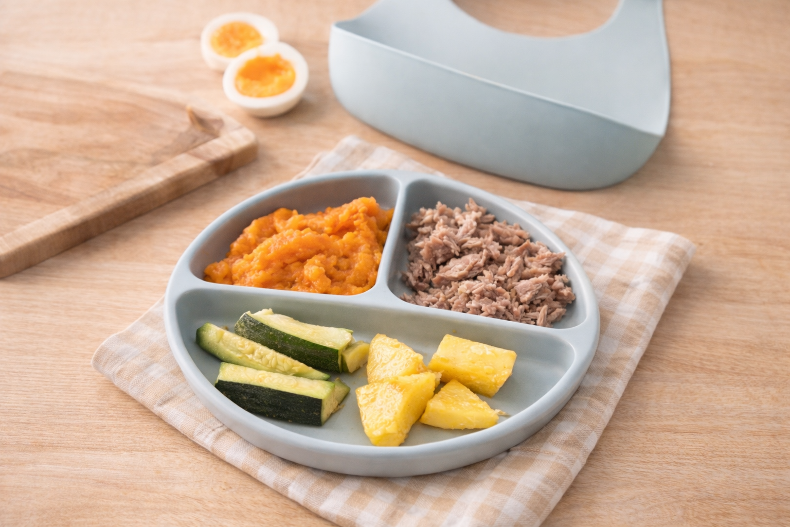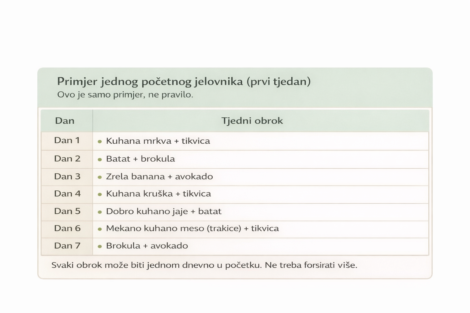 U početku je dovoljno 1–3 namirnice po obroku. Beba istražuje, gnječi i kuša. Možda pojede malo. Možda gotovo ništa. Majčino mlijeko ili adaptirano mlijeko i dalje su primarni izvor prehrane do prve godine. Hrana je dodatak, ne zamjena.